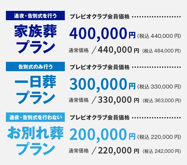 小規模な葬儀用にリーズナブルな「3プラン」をご用意しています。通夜・告別式を行う「家族葬」、告別式のみ行う「一日葬」、通夜・告別式を行わない「お別れ葬」の3プランからお選びいただけます。ご選択プランをベースに、ご希望にあわせて内容を調整いたします。